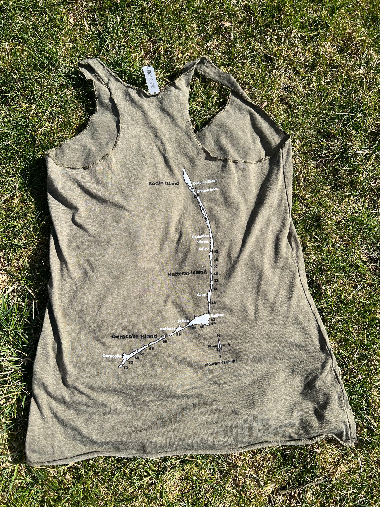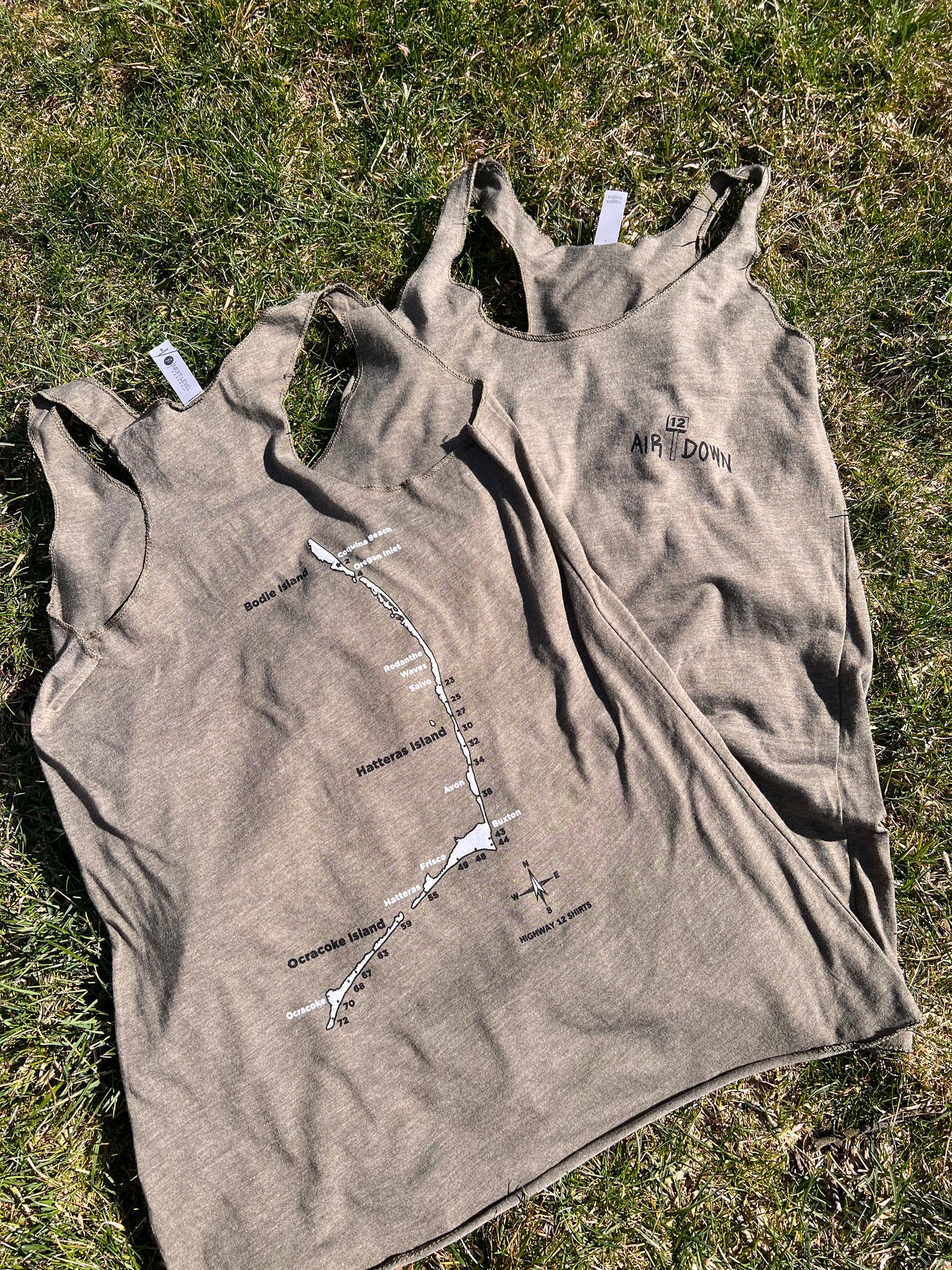 We are lucky enough to drive on many of the beaches along the Outer Banks. As you know, we air down tires so we don't get stuck in the sand. Listed on the back of the shirt are all of the ramps from Bodie Island through Hatteras Island and over to Ocracoke Island. Military Green.