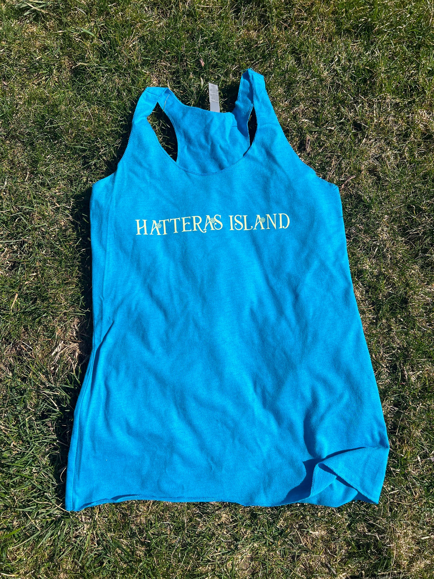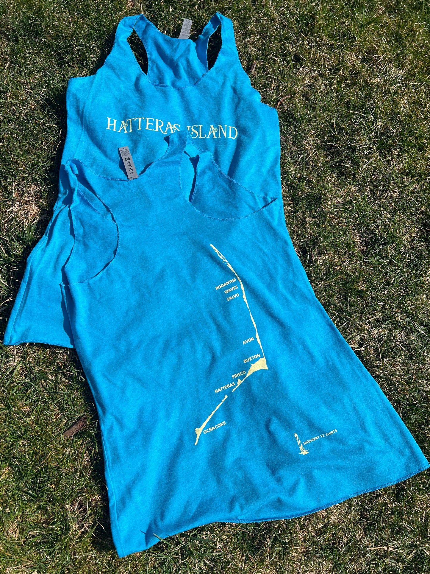 Our Jobell design is now on a vintage turquoise tank with the map on Hatteras Island on the back of the shirt. Jobells have a great history to their name and are beautiful flowers as you walk to the beach. Vintage Turquoise.