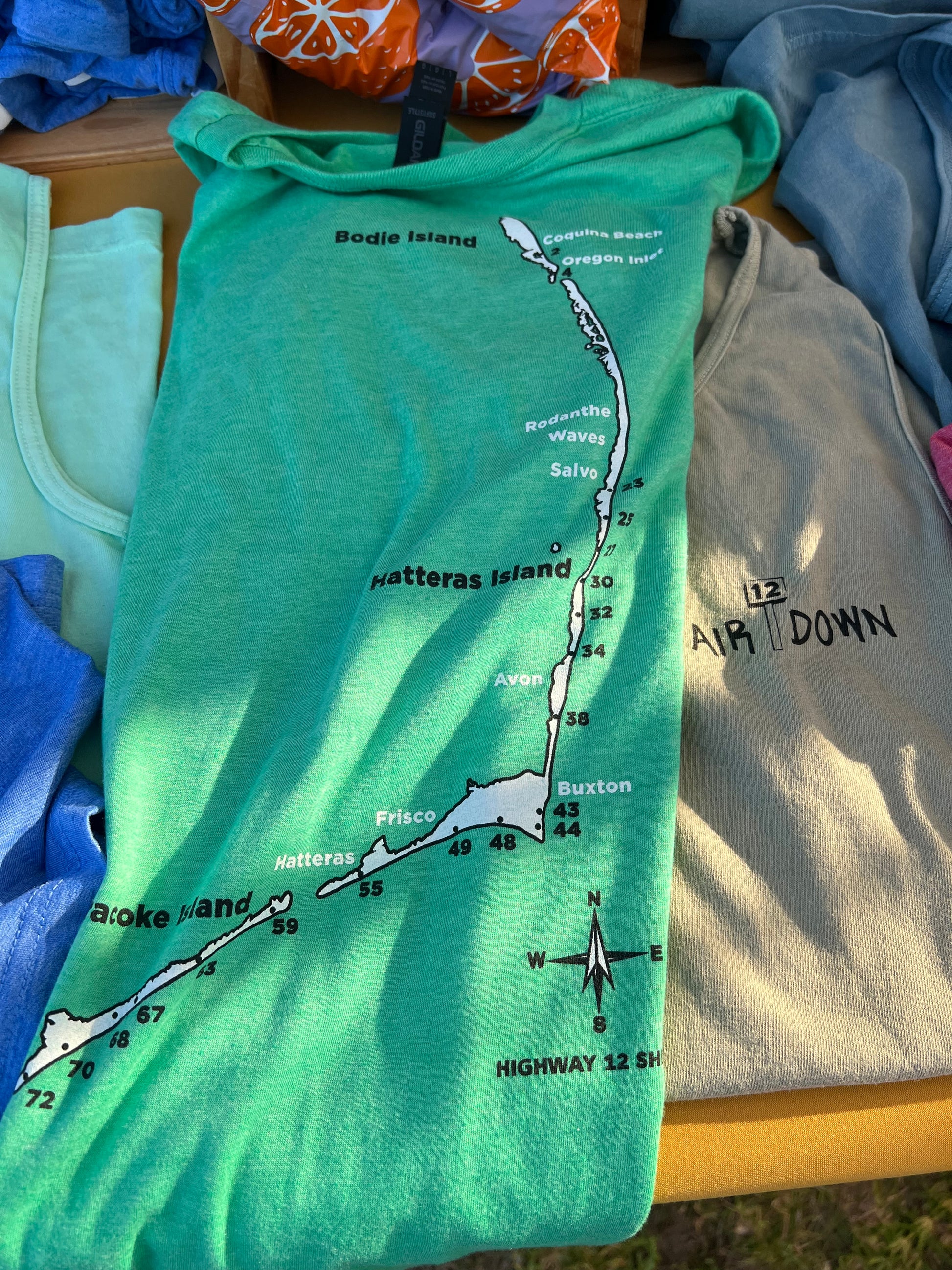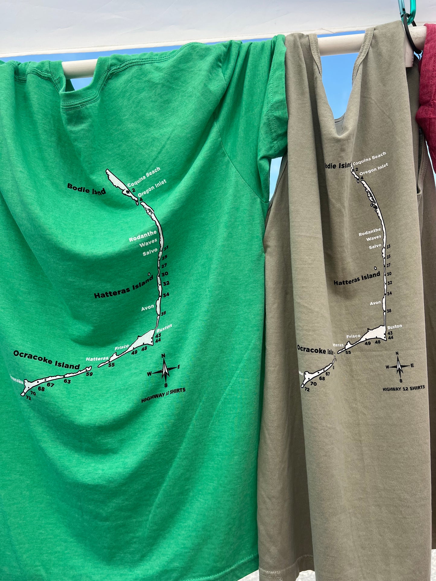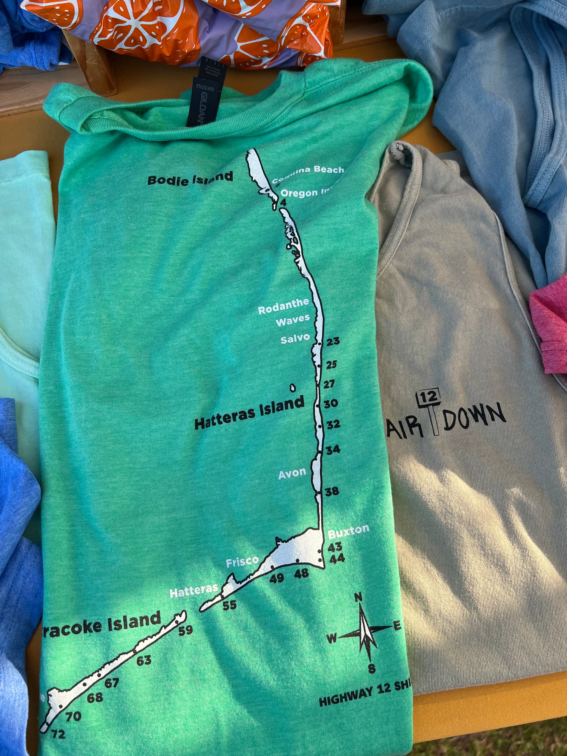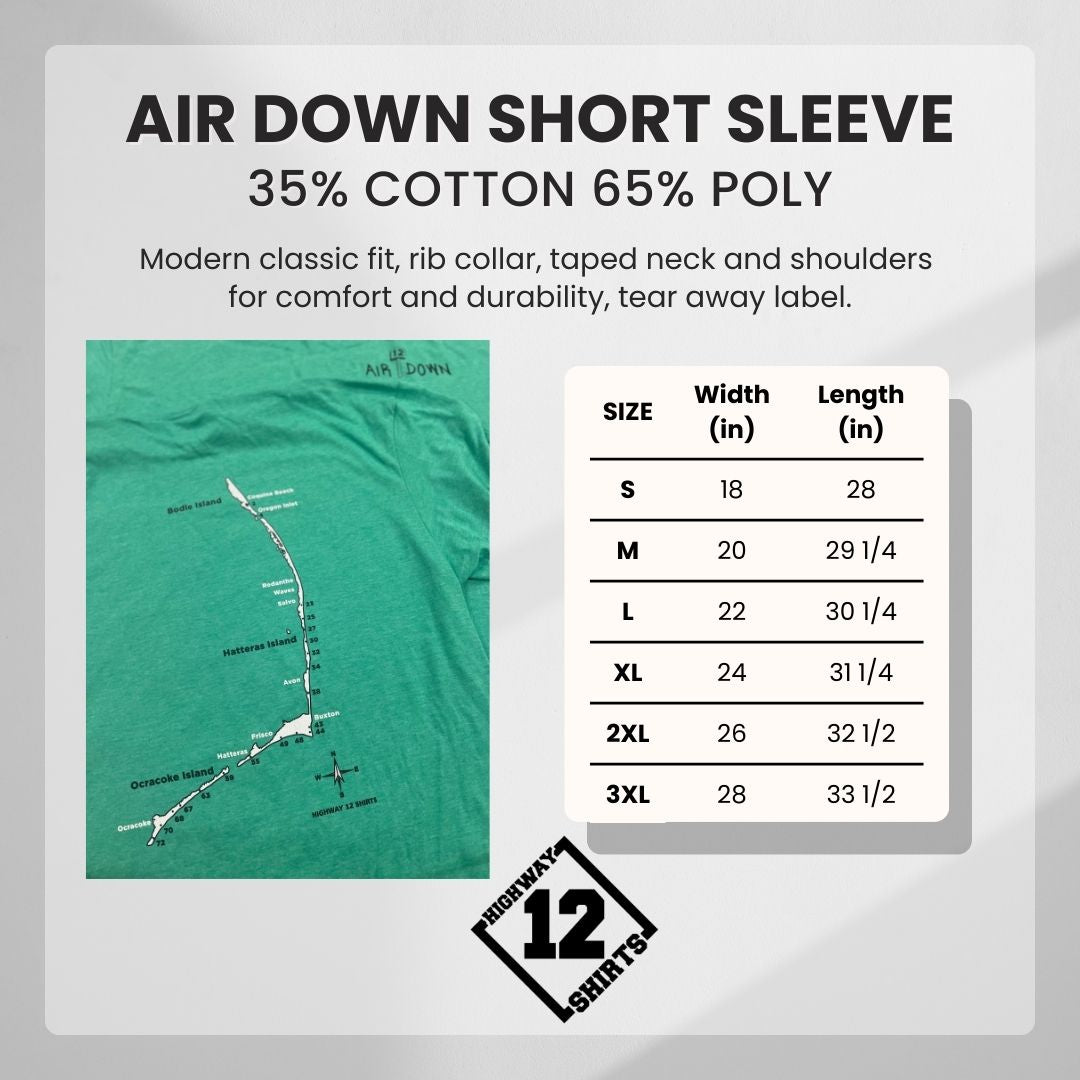 We are lucky enough to drive on many of the beaches along the Outer Banks. As you know, we air down tires so we don't get stuck in the sand. Listed on the back of the shirt are all of the ramps from Bodie Island through Hatteras Island and over to Ocracoke Island. Heather's are on a soft, pre-shrunk poly/cotton blend shirt. Stone Blue is on a soft, all cotton shirt.