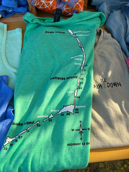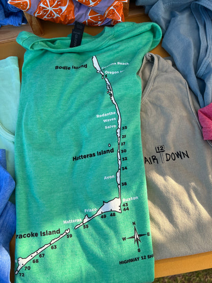 A comfy shirt that celebrates the coastal tradition of airing down tires before sandy drives, complete with a list of beach ramps from Bodie Island to Ocracoke. Comes in soft blends and a charming “Stone Blue” hue.
