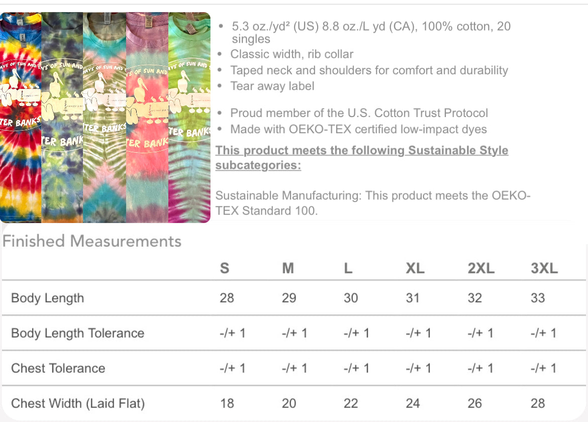 The Outer Banks seem to have endless days of sun and sea surrounding! Hands on tie dye is an art rather than an exact science. The photos show the prevalent dye colors in each design, they are not exactly like the pictures shown, but pretty darn close.